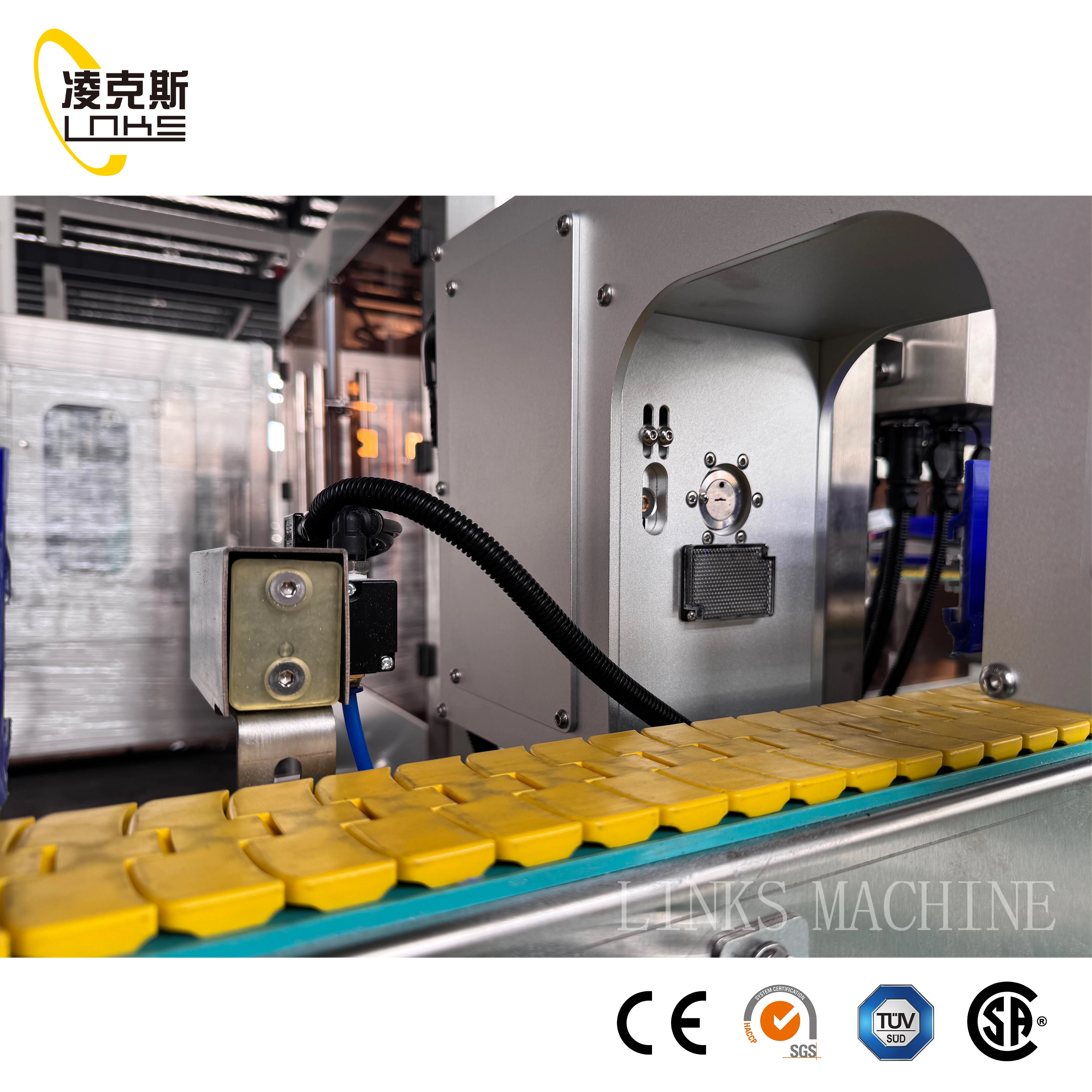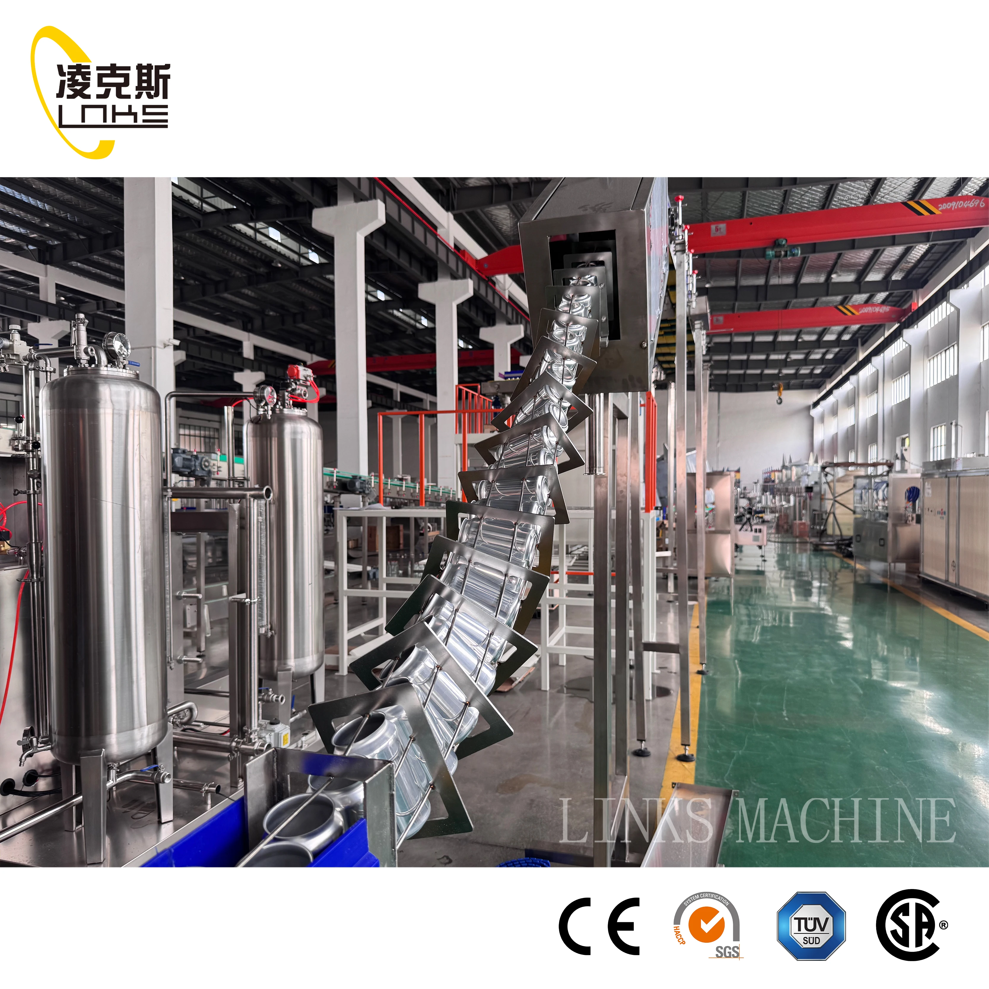 Automatic 3-in-1 CSD production line for carbonated cola and sparkling water cans. Combines rinsing, filling, and capping in a single machine, ensuring high-speed, precise, and hygienic beverage packaging.