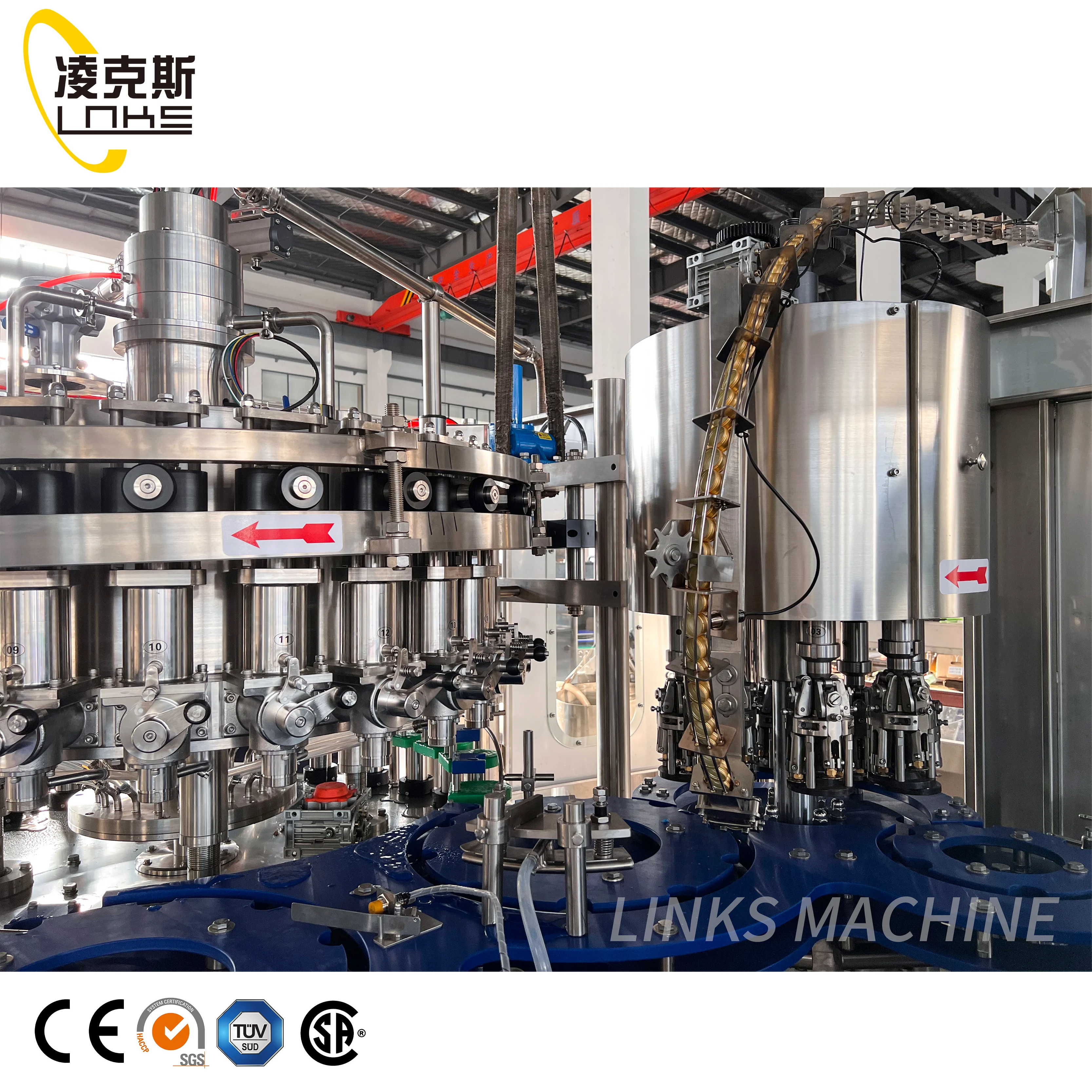 Máquina de enchimento de refrigerantes carbonatados em garrafas de vidro para cola e soda. Instalação de engarrafamento totalmente automática garante enchimento, tampa e embalagem precisos, eficientes e higiênicos para produção de bebidas de alta qualidade.